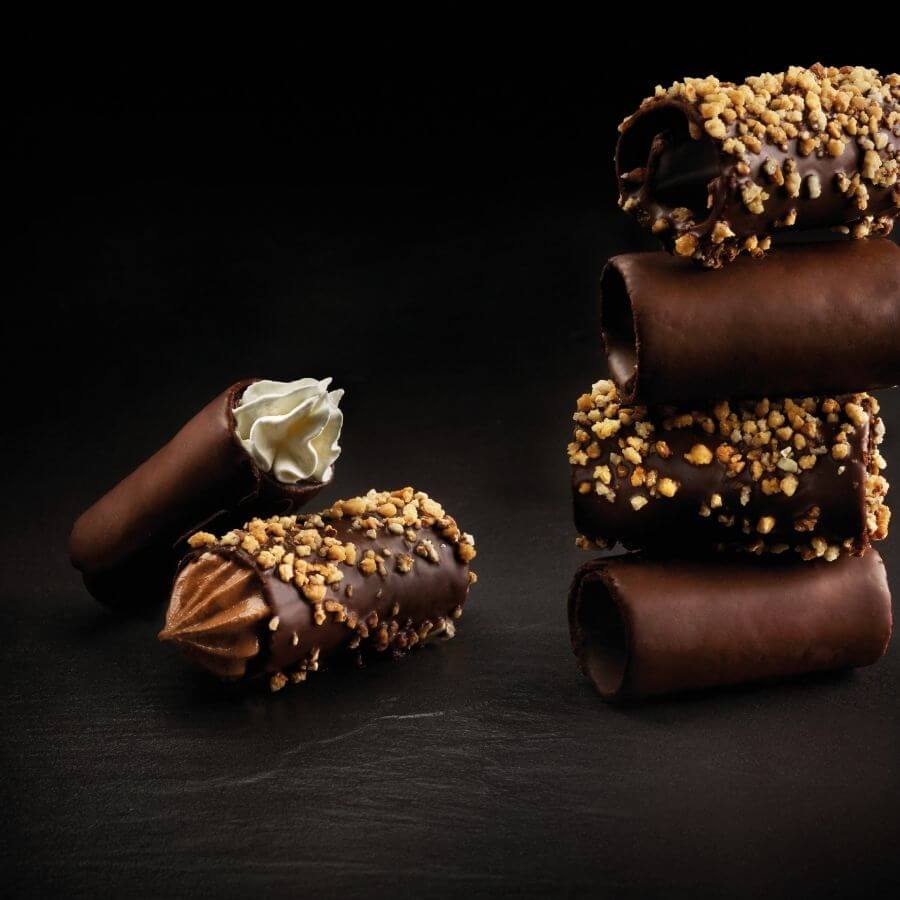 Mini rouleau de gaufrette fine, nappé de chocolat fin. Base sucrée prête à garnir, résistant à l’humidité, sa recette lui donne une texture à la fois fondante et croustillante.