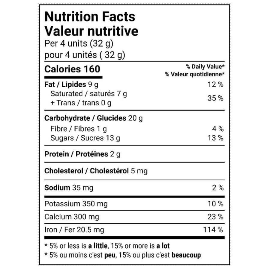 Enrobage : sucre, matières grasse végétales (palmiste, palme), poudre de cacao maigre, lécithine de tournesol, Tristéarate de sorbitane, Polycinoléate de polyglycérol, arôme naturel de vanille.
