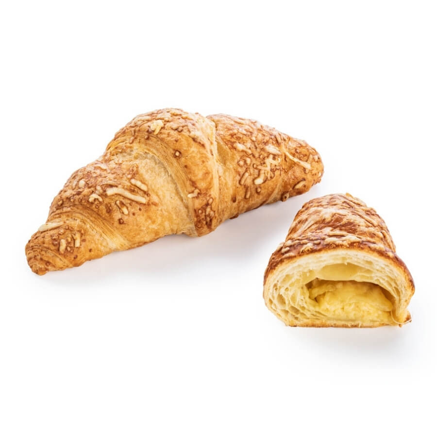 Un croissant généreux et doré prêt à cuire. Une délicieuse viennoiserie salée, composée de couches de pâte feuilletée associées à la saveur généreuse du fromage fondu (fourré avec une garniture de fromage moelleuse 14%) et décoré avec de l’emmenthal (4,5%).