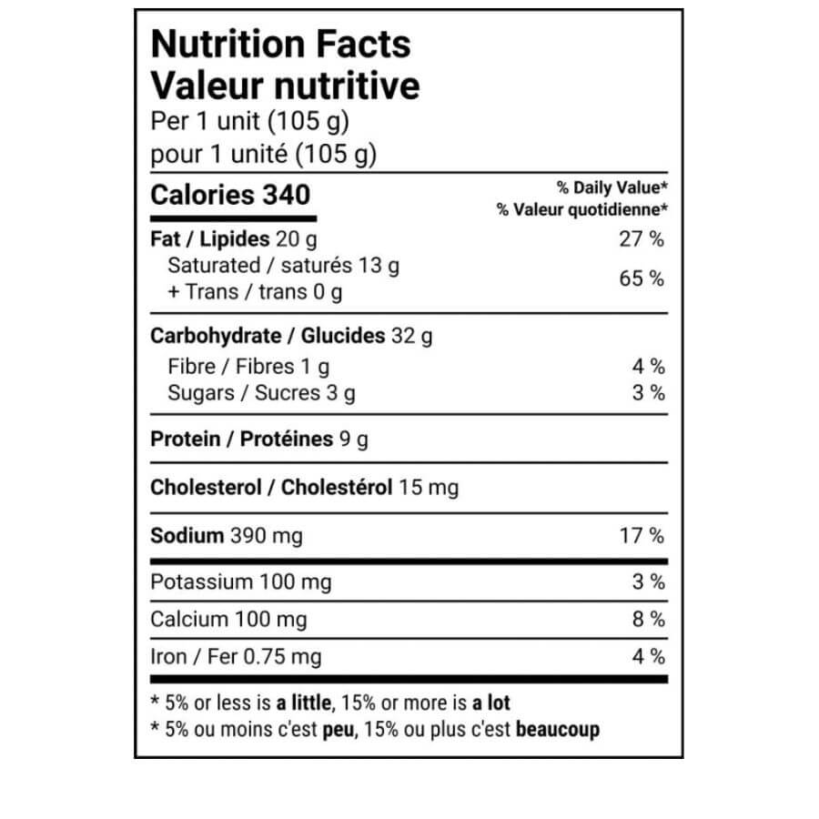 Farine de blé, Eau, Huiles et graisses végétales (palme, tournesol), Fromage emmental (lait entier, amidon, sel, cultures bactériennes, présure microbienne), Fromage (lait entier, amidon, sel, cultures bactériennes, présure microbienne), Sucres (sirop de glucose-fructose, sucre, sirop de glucose), Beurre, Levure, Gluten de blé, Oeuf, Amidon de maïs, Sel, Poudre de lait écrémé, Poudre d’oeuf, Arôme naturel, Fromage en poudre, Maltodextrine, Arôme naturel de fromage, Lactoprotéines, Épices, Acidifiant (acide ascorbique, acide lactique), Agent de traitement de la farine (acide ascorbique), Enzymes (hémicellulase, amylase, cellulase, xylanases).