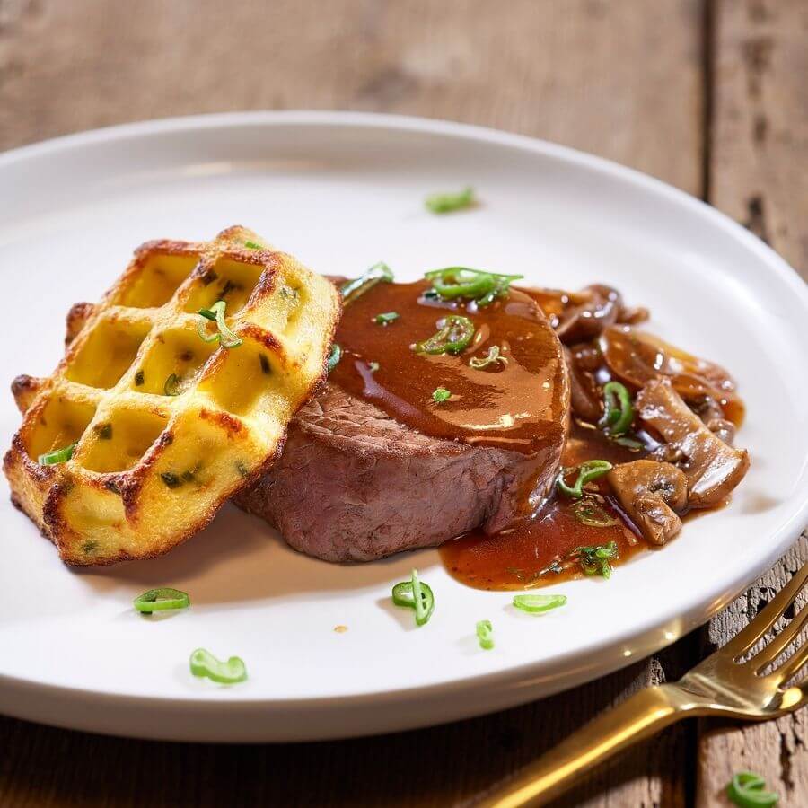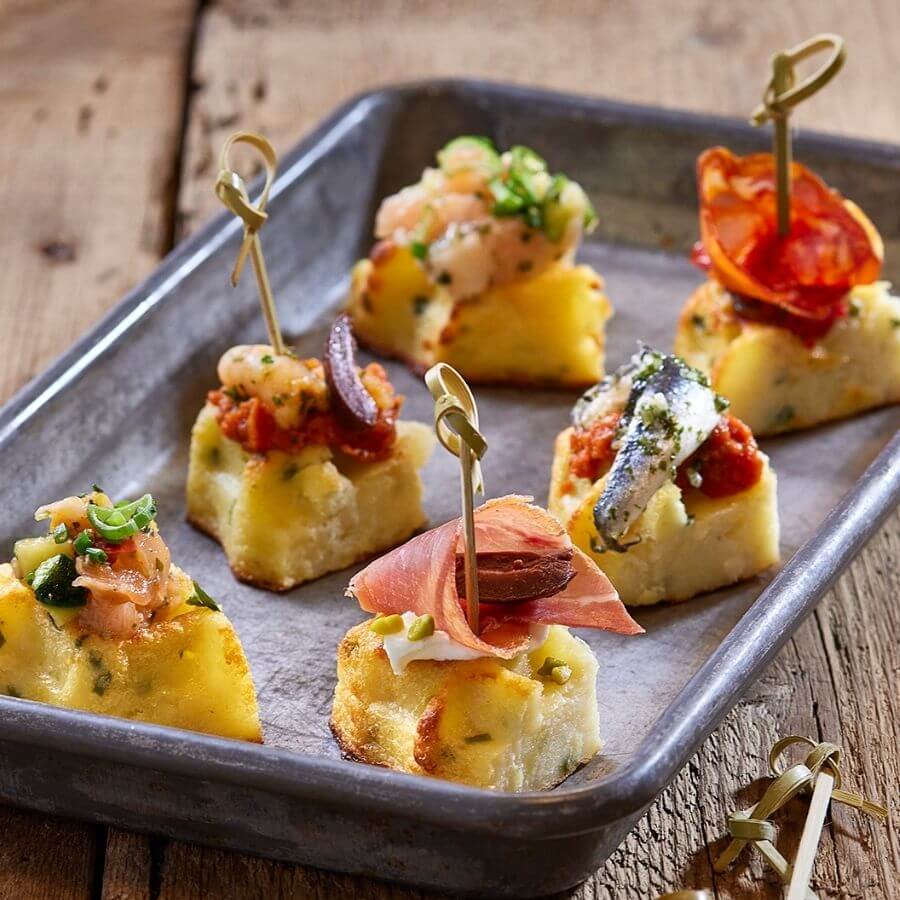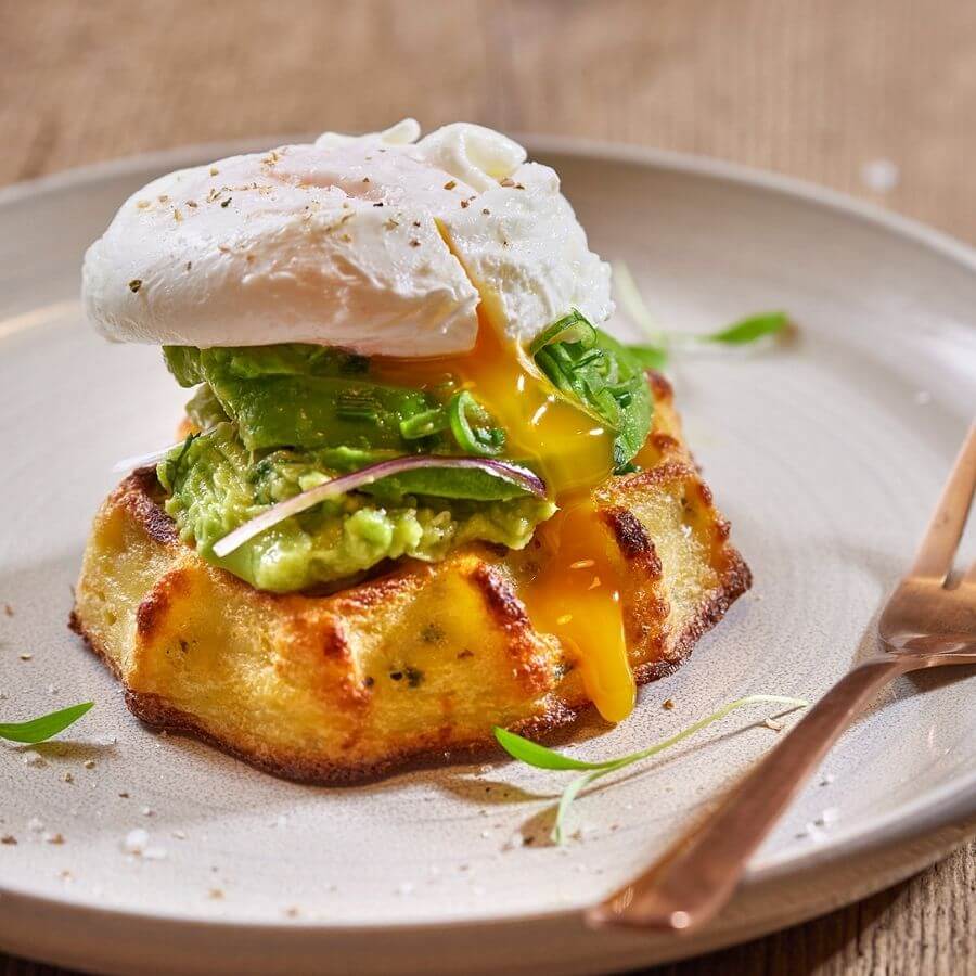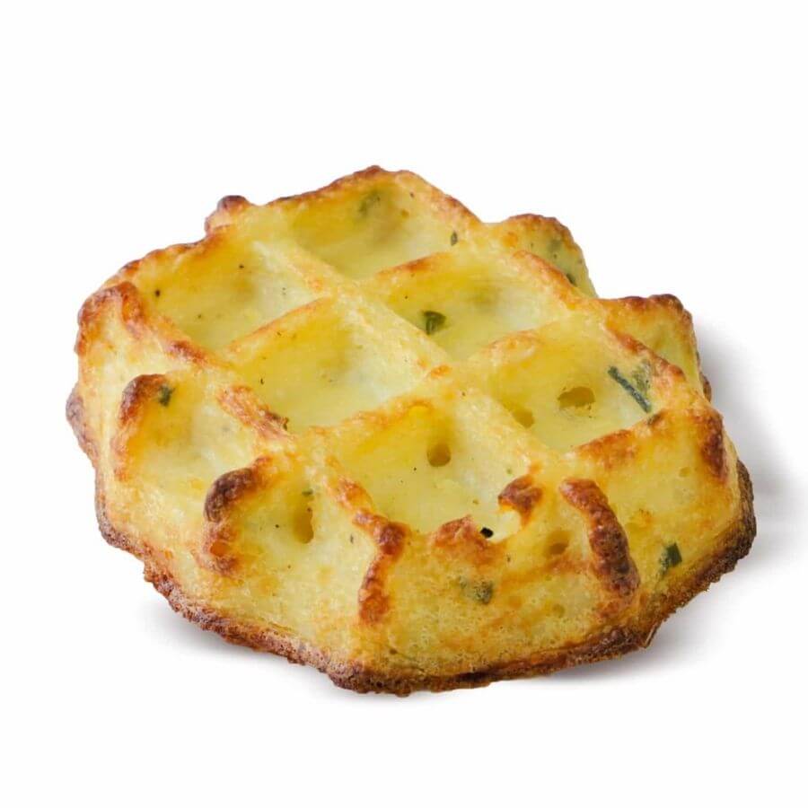 Gaufre de pommes de terre (41%) salée. Cuire au four (produit non frit), avec un extérieur croustillant et léger et un cœur fondant d’écrasé de pommes de terre.