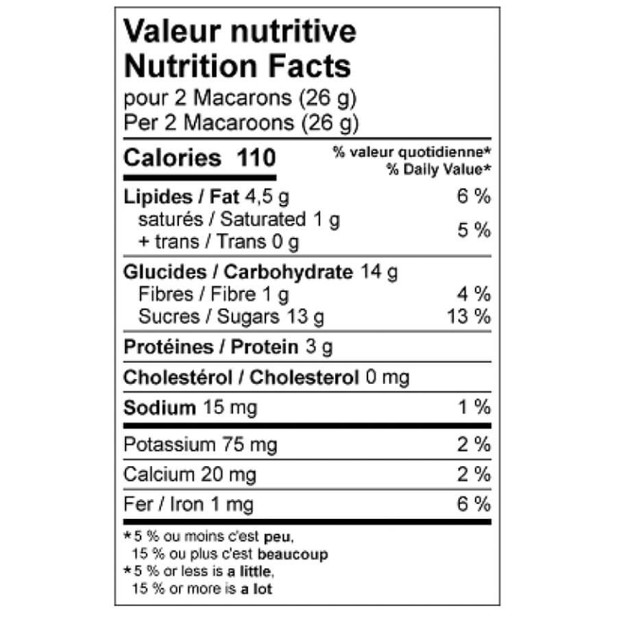 Sucres (sucre, sirop de glucose, sucre caramélisé) ▪ Poudre d’amandes ▪ Blanc d’oeuf liquide ▪ Crème ▪ Chocolat noir (pâte de cacao, sucre, beurre de cacao) ▪ Brisures de framboises ▪ Amidon de maïs et/ou pomme de terre ▪ Poudre de blanc d’oeuf ▪ Jus de citron ▪ Lait écrémé en poudre ▪ Purée de pomme ▪ Citrons ▪ Beurre ▪ Purée de pistache ▪ Concentré de betterave rouge ▪ Pectine ▪ Arômes naturels (vanille, pistache) ▪ Concentré de curcuma ▪ Concentré de carotte et d’hibiscus ▪ Café instantané ▪ Gomme xanthane ▪ Eau ▪ Extrait de spiruline ▪ Graines de vanille épuisées.